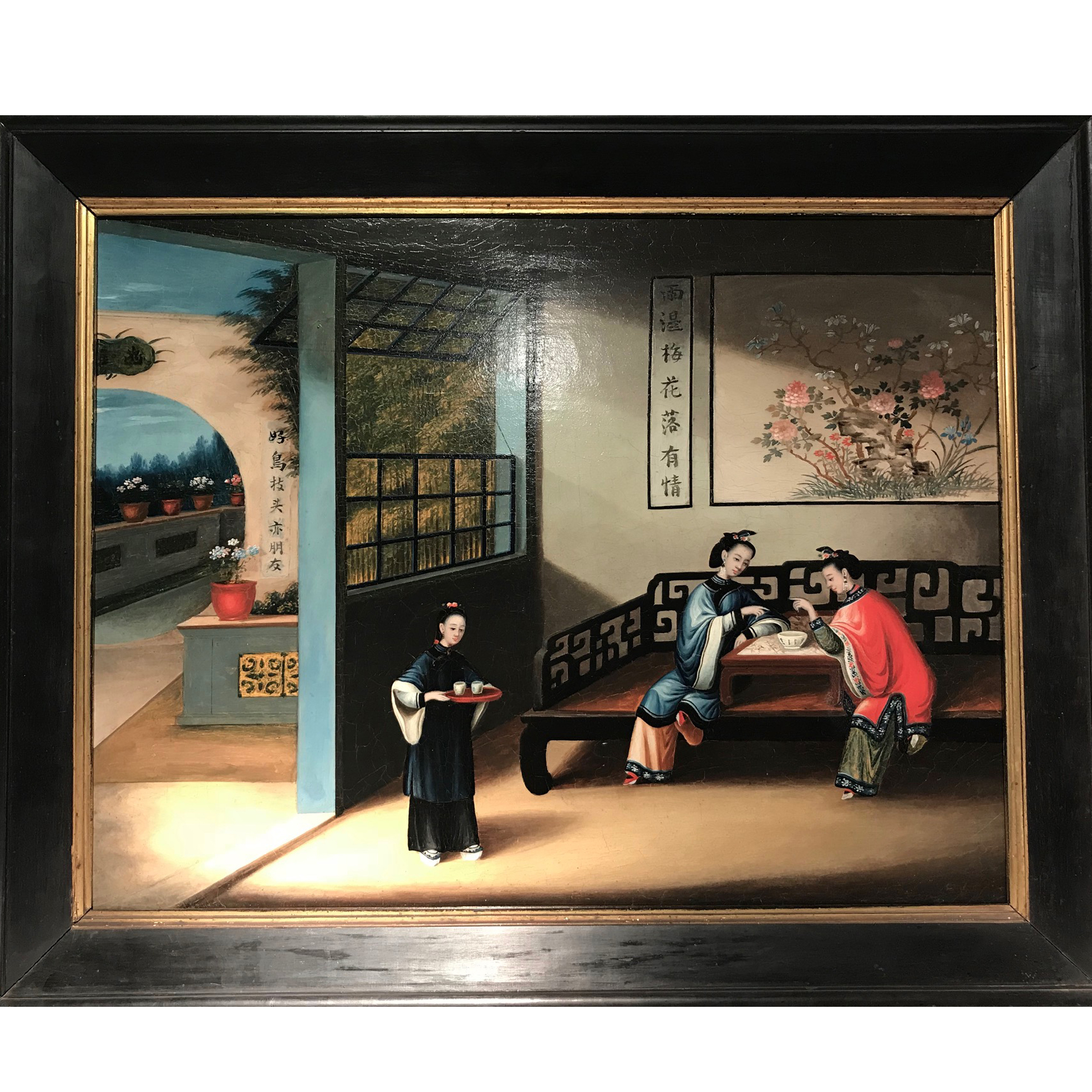 Peinture représentant une scène animée de jeunes femmes. Une ouverture sur le côté de la maison laisse voir un jardin. Deux jeunes femmes sont assises et discutent autour d'un bol en porcelaine. Une autre leur apporte du thé.