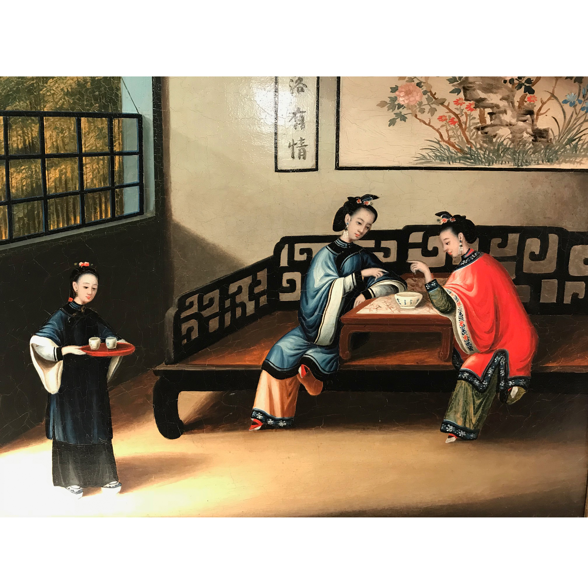 Scène quotidienne de la vie en Chine. Huile sur toile.