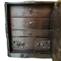 The interior of the box holds 3 large drawers opened by kan (ring) pulls and two smaller ones with a lock plate. The piece has a handle on top for convenient transportation.
